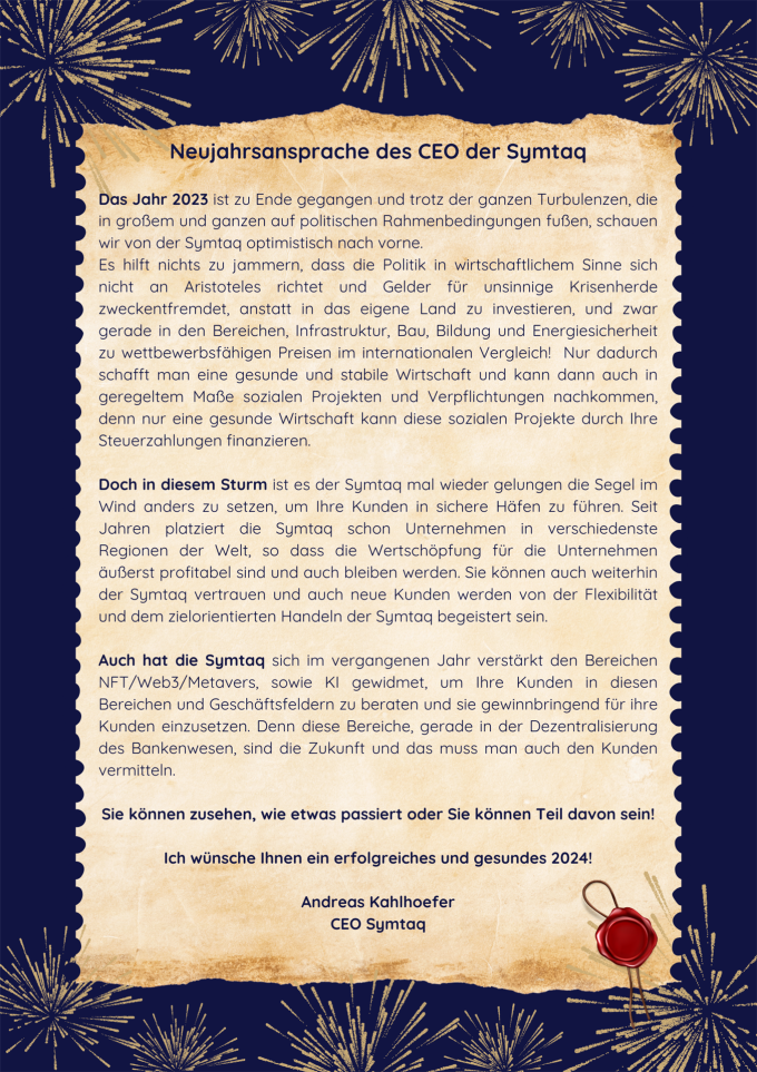 Das Jahr 2023 ist zu Ende gegangen und trotz der ganzen Turbulenzen, die in großem und ganzen auf politischen Rahmenbedingungen fußen, schauen wir von der Symtaq optimistisch nach vorne.